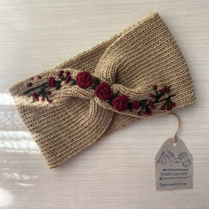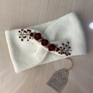 هدبند گلدوزی شده پهنا ۱۱ سانت رنگ شیری گلدوزی زرشکی